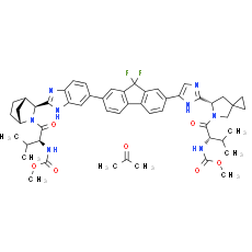 InChi: InChI=1S/C49H54F2N8O6.C3H6O/c1-24(2)39(56-46(62)64-5)44(60)58-23-48(15-16-48)21-38(58)42-52-22-37(55-42)28-9-13-32-31-12-8-26(18-33(31)49(50,51)34(32)19-28)27-10-14-35-36(20-27)54-43(53-35)41-29-7-11-30(17-29)59(41)45(61)40(25(3)4)57-47(63)65-6;1-3(2)4/h8-10,12-14,18-20,22,24-25,29-30,38-41H,7,11,15-17,21,23H2,1-6H3,(H,52,55)(H,53,54)(H,56,62)(H,57,63);1-2H3/t29-,30+,38-,39-,40-,41-;/m0./s1