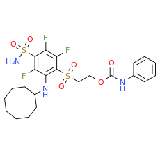 Smiles: NS(=O)(=O)C1=C(F)C(NC2CCCCCCC2)=C(C(F)=C1F)S(=O)(=O)CCOC(=O)NC1C=CC=CC=1