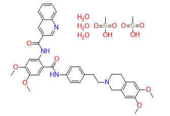 Chemical Name: N-[2-({4-[2-(6,7-dimethoxy-1,2,3,4-tetrahydroisoquinolin-2-yl)ethyl]phenyl}carbamoyl)-4,5-dimethoxyphenyl]quinoline-3-carboxamide bis(methanesulfonic acid) trihydrate