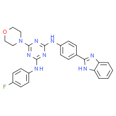 InChi: InChI=1S/C26H23FN8O/c27-18-7-11-20(12-8-18)29-25-32-24(33-26(34-25)35-13-15-36-16-14-35)28-19-9-5-17(6-10-19)23-30-21-3-1-2-4-22(21)31-23/h1-12H,13-16H2,(H,30,31)(H2,28,29,32,33,34)
