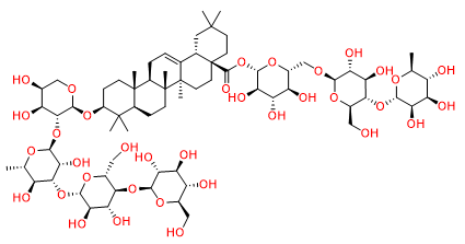 Chemical Name: (2S,3R,4S,5S,6R)-6-({[(2R,3R,4R,5S,6R)-3,4-dihydroxy-6-(hydroxymethyl)-5-{[(2S,3R,4R,5R,6S)-3,4,5-trihydroxy-6-methyloxan-2-yl]oxy}oxan-2-yl]oxy}methyl)-3,4,5-trihydroxyoxan-2-yl (4aS,6aS,6bR,8aR,10S,12aR,12bR,14bS)-10-{[(2S,3R,4S,5S)-3-{[(2S,3R,4R,5S,6S)-4-{[(2S,3R,4R,5S,6R)-3,4-dihydroxy-6-(hydroxymethyl)-5-{[(2S,3R,4S,5S,6R)-3,4,5-trihydroxy-6-(hydroxymethyl)oxan-2-yl]oxy}oxan-2-yl]oxy}-3,5-dihydroxy-6-methyloxan-2-yl]oxy}-4,5-dihydroxyoxan-2-yl]oxy}-8a,12b,14b-trihydrogenio-2,2,6a,6b,9,9,12a-heptamethyl-1,2,3,4,4a,5,6,6a,6b,7,8,8a,9,10,11,12,12a,12b,13,14b-icosahydropicene-4a-carboxylate