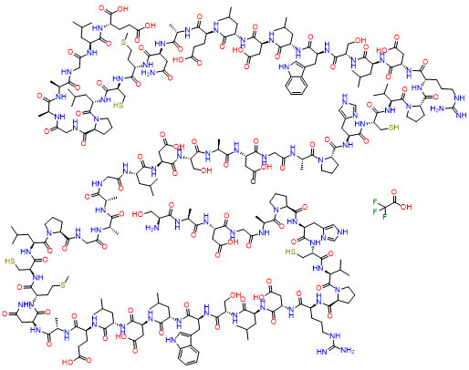 Smiles: C[C@H](NC(=O)[C@H](CO)NC(=O)[C@H](CC(O)=O)NC(=O)[C@H](CC(C)C)NC(=O)CNC(=O)[C@H](C)NC(=O)[C@H](C)NC(=O)CNC(=O)[C@@H]1CCCN1C(=O)[C@H](CC(C)C)NC(=O)[C@H](CS)NC(=O)[C@H](CCSC)NC(=O)[C@H](CC(N)=O)NC(=O)[C@H](C)NC(=O)[C@H](CCC(O)=O)NC(=O)[C@H](CC(C)C)NC(=O)[C@H](CC(O)=O)NC(=O)[C@H](CC(C)C)NC(=O)[C@H](CC1=CNC2=CC=CC=C12)NC(=O)[C@H](CO)NC(=O)[C@H](CC(C)C)NC(=O)[C@H](CC(O)=O)NC(=O)[C@H](CCCNC(N)=N)NC(=O)[C@@H]1CCCN1C(=O)[C@@H](NC(=O)[C@H](CS)NC(=O)[C@H](CC1=CNC=N1)NC(=O)[C@@H]1CCCN1C(=O)[C@H](C)NC(=O)CNC(=O)[C@H](CC(O)=O)NC(=O)[C@H](C)NC(=O)[C@@H](N)CO)C(C)C)C(=O)N[C@@H](CC(O)=O)C(=O)NCC(=O)N[C@@H](C)C(=O)N1CCC[C@H]1C(=O)N[C@@H](CC1=CNC=N1)C(=O)N[C@@H](CS)C(=O)N[C@@H](C(C)C)C(=O)N1CCC[C@H]1C(=O)N[C@@H](CCCNC(N)=N)C(=O)N[C@@H](CC(O)=O)C(=O)N[C@@H](CC(C)C)C(=O)N[C@@H](CO)C(=O)N[C@@H](CC1=CNC2=CC=CC=C12)C(=O)N[C@@H](CC(C)C)C(=O)N[C@@H](CC(O)=O)C(=O)N[C@@H](CC(C)C)C(=O)N[C@@H](CCC(O)=O)C(=O)N[C@@H](C)C(=O)N[C@@H](CC(N)=O)C(=O)N[C@@H](CCSC)C(=O)N[C@@H](CS)C(=O)N[C@@H](CC(C)C)C(=O)N1CCC[C@H]1C(=O)NCC(=O)N[C@@H](C)C(=O)N[C@@H](C)C(=O)NCC(=O)N[C@@H](CC(C)C)C(=O)N[C@@H](CCC(O)=O)C(O)=O.OC(=O)C(F)(F)F