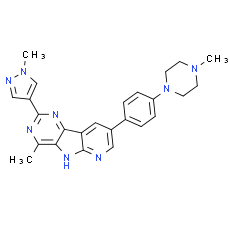 InChi: InChI=1S/C25H26N8/c1-16-22-23(30-24(28-16)19-14-27-32(3)15-19)21-12-18(13-26-25(21)29-22)17-4-6-20(7-5-17)33-10-8-31(2)9-11-33/h4-7,12-15H,8-11H2,1-3H3,(H,26,29)