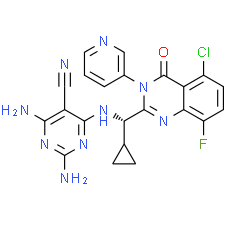 Chemical Name: 2,4-diamino-6-{[(S)-[5-chloro-8-fluoro-4-oxo-3-(pyridin-3-yl)-3,4-dihydroquinazolin-2-yl](cyclopropyl)methyl]amino}pyrimidine-5-carbonitrile