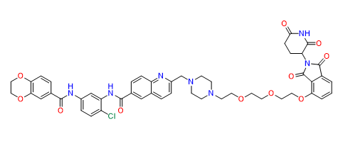 Chemical Name: N-[2-chloro-5-(2,3-dihydro-1,4-benzodioxine-6-amido)phenyl]-2-[(4-{2-[2-(2-{[2-(2,6-dioxopiperidin-3-yl)-1,3-dioxo-2,3-dihydro-1H-isoindol-4-yl]oxy}ethoxy)ethoxy]ethyl}piperazin-1-yl)methyl]quinoline-6-carboxamide