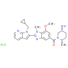 InChi: InChI=1S/C27H32N6O2.ClH/c1-16-6-9-20(28)15-32(16)27(34)19-11-21-24(23(13-19)35-3)31(2)26(30-21)22-12-18-5-4-10-29-25(18)33(22)14-17-7-8-17;/h4-5,10-13,16-17,20H,6-9,14-15,28H2,1-3H3;1H/t16-,20+;/m0./s1