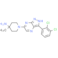 Smiles: CC1(N)CCN(CC1)C1C=NC2C(N=1)=NNC=2C1=CC=CC(Cl)=C1Cl