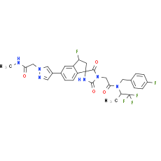 Smiles: CC(N(CC1=CC=C(F)C=C1)C(=O)CN1C(=O)C2(CC(F)C3=CC(=CC=C23)C2=CN(CC(=O)NC)N=C2)NC1=O)C(F)(F)F
