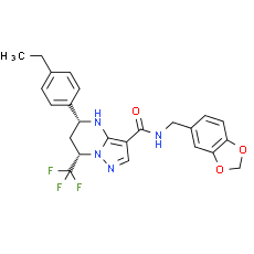 InChi: InChI=1S/C24H23F3N4O3/c1-2-14-3-6-16(7-4-14)18-10-21(24(25,26)27)31-22(30-18)17(12-29-31)23(32)28-11-15-5-8-19-20(9-15)34-13-33-19/h3-9,12,18,21,30H,2,10-11,13H2,1H3,(H,28,32)/t18-,21+/m1/s1
