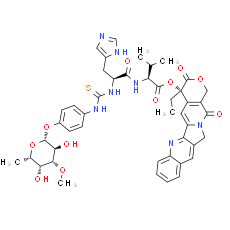 Smiles: CC(C)[C@H](NC(=O)[C@H](CC1=CN=CN1)NC(=S)NC1=CC=C(C=C1)O[C@H]1O[C@@H](C)[C@@H](O)[C@@H](OC)[C@@H]1O)C(=O)O[C@]1(CC)C(=O)OCC2=C1C=C1C3=NC4=CC=CC=C4C=C3CN1C2=O
